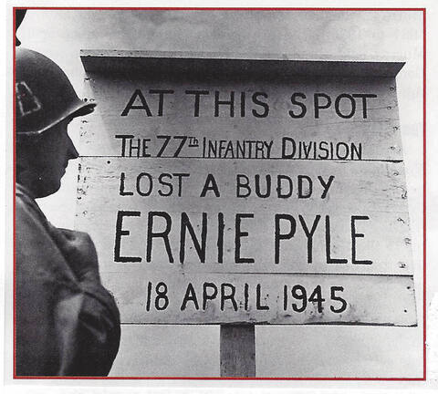 On April 18, 1945, he was killed by enemy machine-gun fire on the island of Iegima, northeast of Okinawa. The infantry troops erected the temporary monument, above, which was later recreated in stone. A B-29 bomber was named in his honor, and his name is memorialized in scholarships, schools, libraries, a highway, park, and historic sites. He is buried in the National Memorial Cemetery of the Pacific on Oahu. He ended Brave Man with the hope, "All of us together will... reassemble our broken world into a pattern so firm and so fair that another great war cannot soon be possible."